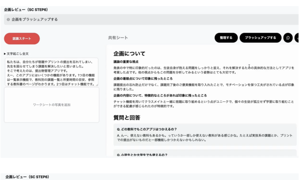 企画を音声・文章・画像で入力すると、生成AIがコメントや問いを返し、企画のブラッシュアップのきっかけをつくります。