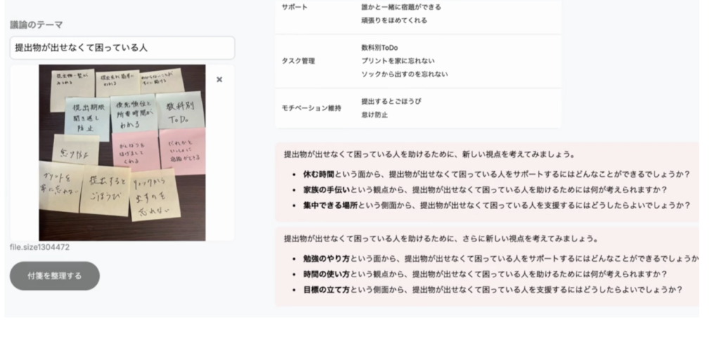 ブレインストーミングで出たアイデアを書き出した付箋を撮影し、生成AIに読み込ませると、アイデアが自動で分類されます。さらに、まだ出ていないアイデアにつながる新たな観点が提示され、生徒のさらなる思考の広がりを手助けします。