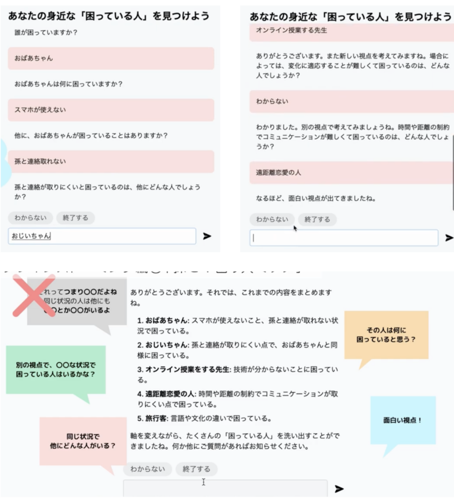 生徒が最初に思いついた「困っている人」を入力すると、「その人は何に困っていますか?」「本当にその人自身の問題ですか?」「他にその〇〇で困っていそうな人はいますか?」など生成AIが質問を返します。これにより、その困りごとにさらに近い存在を連想させたり、視点を変えて新しい発想を引き出したりと、多角的な視点を引き出し、質を高めながらたくさんのアイデアを出すサポートをします。